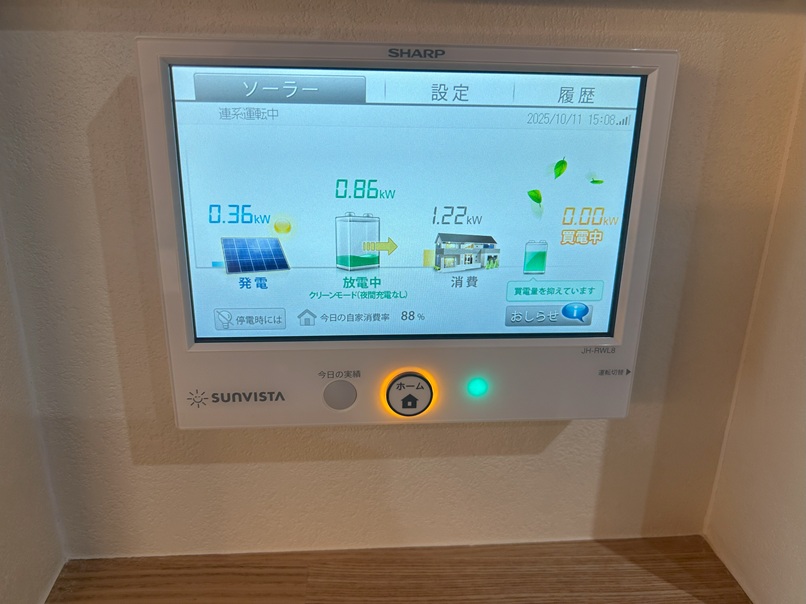 蓄電池から0.86kw電気をつかい 買電 0 でAIが調整してくれています。凄いですね(^^♪