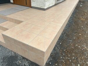 タイルに水勾配を付ける為、振れスミ(45度の角度でない角度)でタイルがカットしてあります。