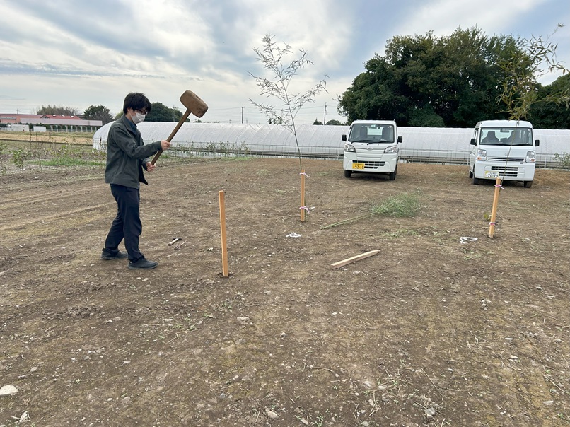 今日は、竹と、小舞縄の準備から始めました。竹を縛る杭を4本打ちます。