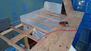 上棟式の時に施工していました下屋の野地ですが、同じく、タイベックシルバー~タルキ~野地がはじまり~