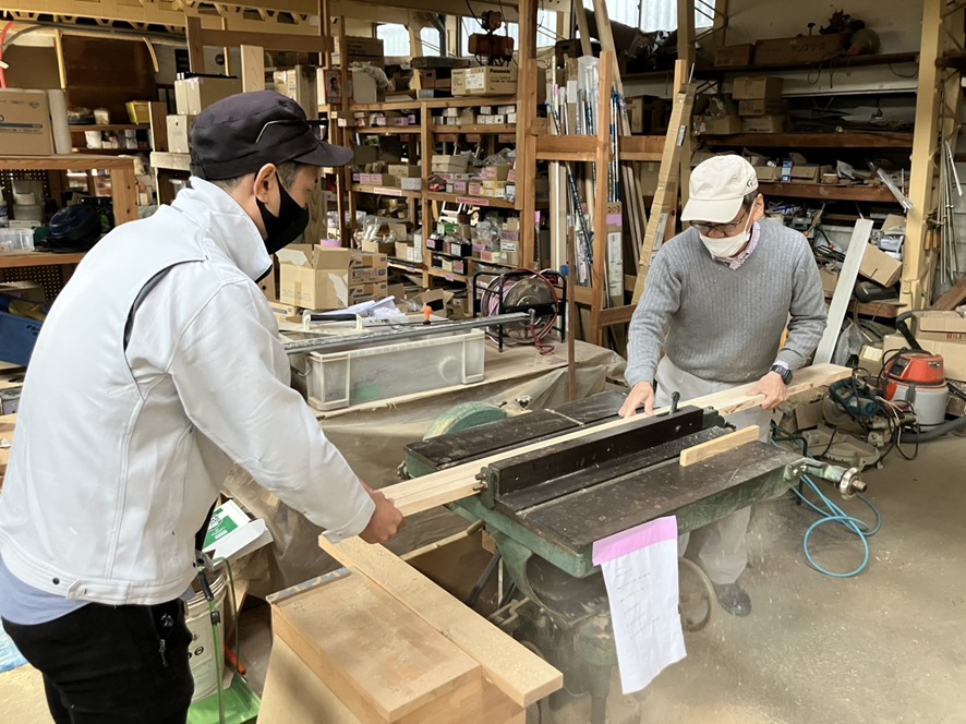今日は、棚の受け残を作りたいと、「正也ン」「アッキー」から相談を受けて 風間工務店作業場へ脚を運びました。