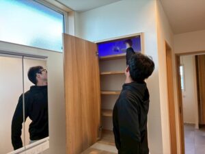 それを見た「アッキー」扉の中まで吹付ています。 念入り過ぎるくらい 無事吹付を行いました。 天井は、セラミッククロスで(吹付不要)