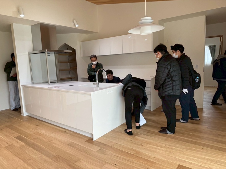 キッチンにコンセントと、スイッチを仕込んだのでその線の確認をしていました。マニアックメンバーですね(*´Д`)