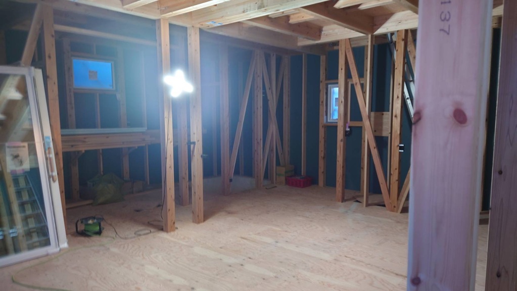 室内は、こんな感じで今日は、電気配線を行いました。 段々に出来ていきます。楽しみですね(^^♪