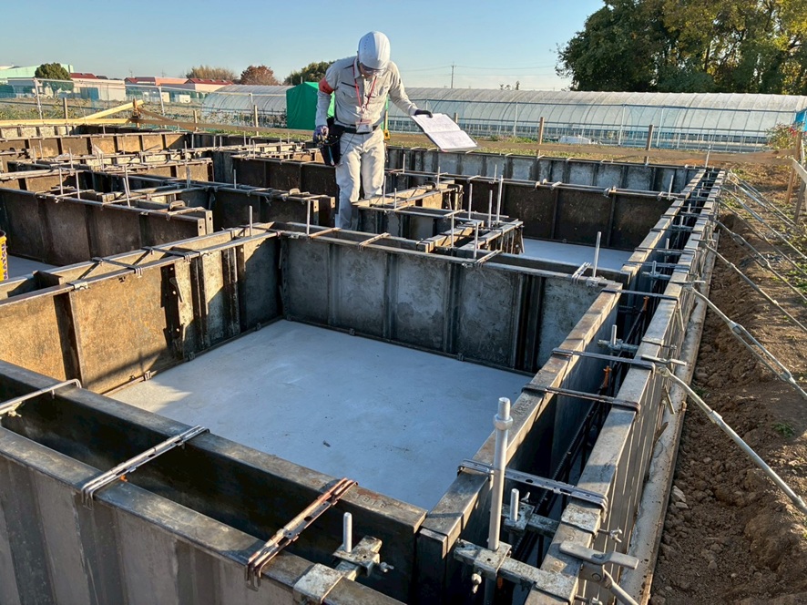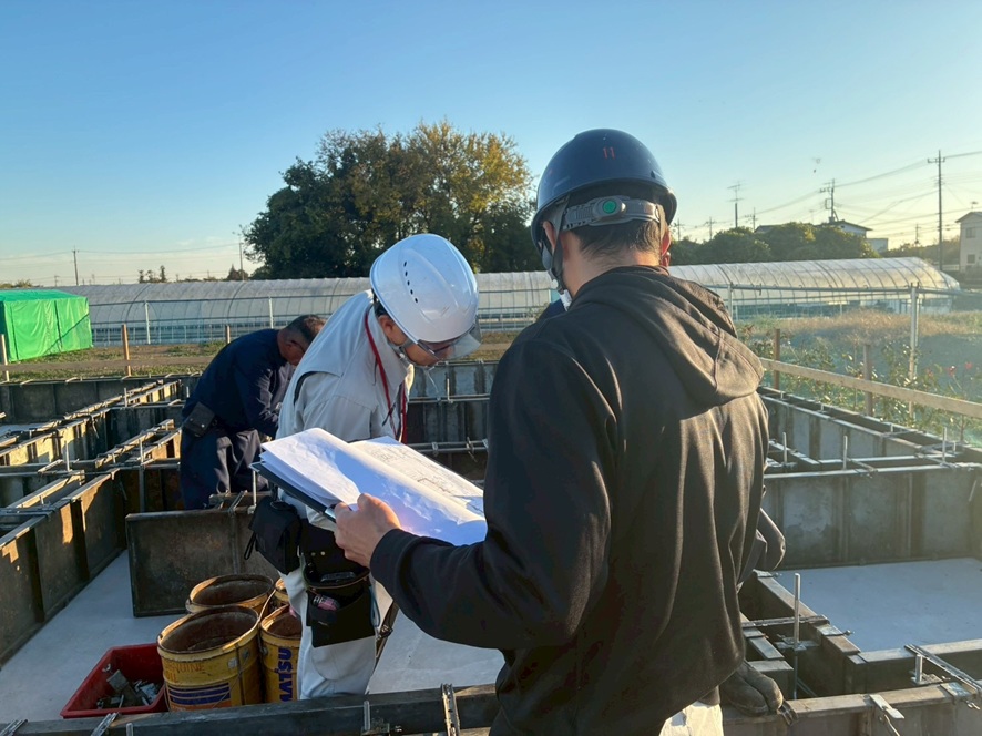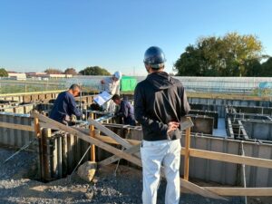今日は、免鳥町のT様邸の基礎枠の検査を行いました。 検査員の方と「アッキー」チェックしています。