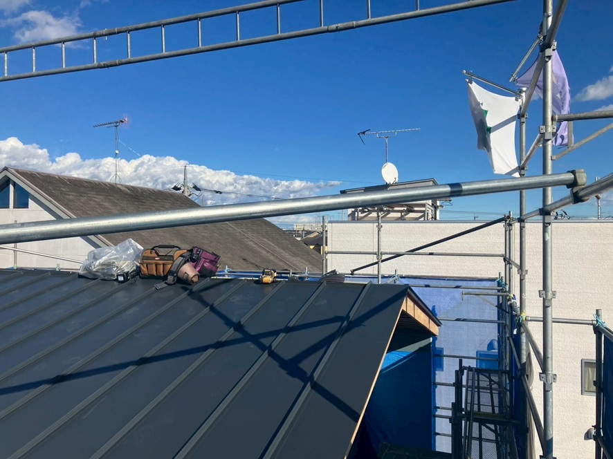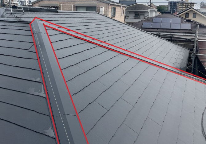 下り棟とは、寄棟屋根の斜めの下っていく部分のところです。 このように一般的には、幅がひろい板金でかぶせていきます。