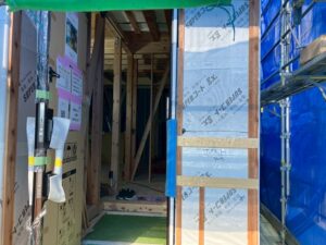 ポストの下地も入りました。 横の下地は、エアホールと言い通気が取れるように加工されています。