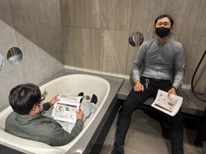 最高級のユニットバスでくつろいでいるスタッフ2名・・ 気持ちよさそうです!