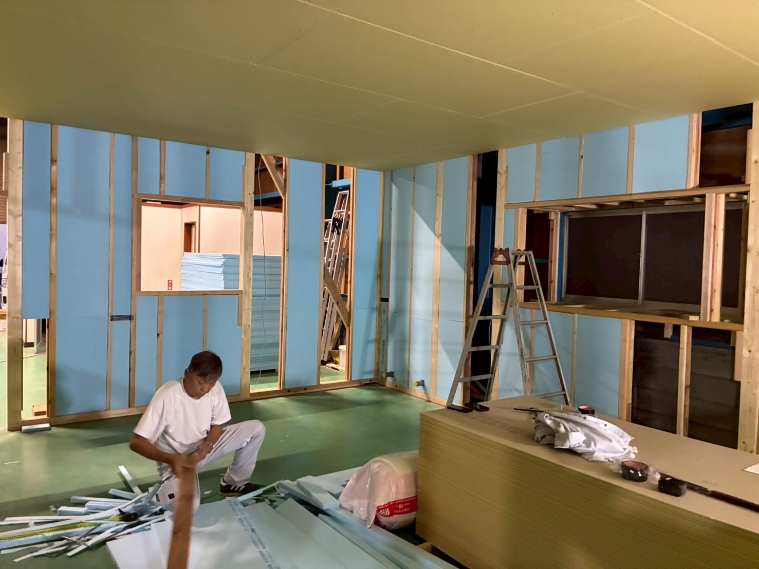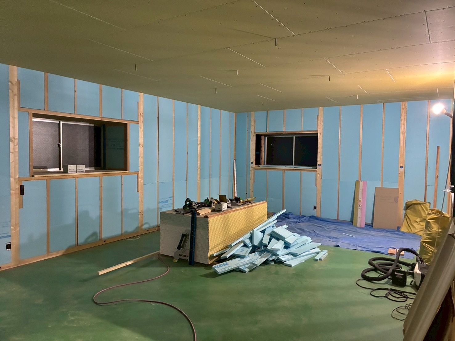 大きな2室の外側からの写真です。 天井を張りその上にグラスウールを敷~壁には、スタイロフォームを切り込んでいています。