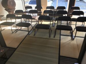 会長さんのはからいで椅子が準備され(今までは、座布団に座ってでした・・)