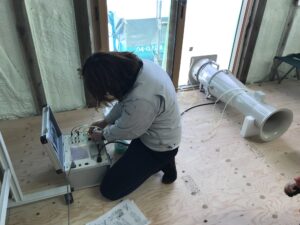 気密測定士の「池やん」真面目に測定しています。