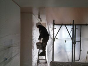 室内では、ローラー漆喰吹付の段取りを塗装屋さんはじまりました。