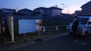早速、天神町の現場、第一号看板設置!「ふじまー」監督余裕の表情!(^^♪