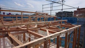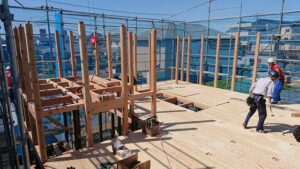 堀米町のS様邸の上棟です。 2階の床の根太レス合板を貼ったところの写真です。