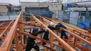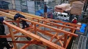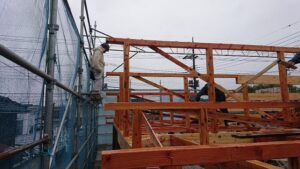 昨日の堀米町のT様邸上棟は、前日に柱と、桁を組んだ後から始まりました。