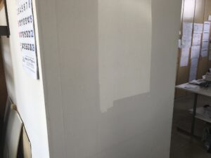 本社の壁です。この面に珪藻土を塗ります(天然スタイル)□で白くなっているのは、朝日の反射です。
