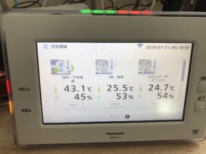 モデルの温度計ですが、室内は、快適ですが、外気温が43.1℃多分東の壁にセンサーが