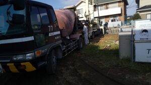 ポンプ車~生コン車が入り無事にコンクリート打ち完了しました。