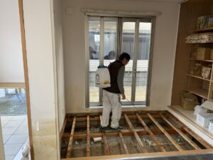 今日の午後は、オフィスで「ホウ酸」での床下地散布作業を行いました。