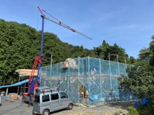 今日は、閑馬町のN様邸の上棟です。行った時は、「ドラゴン」(電気式クレーン)を伸ばしている