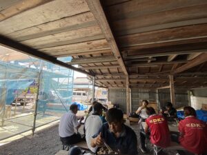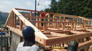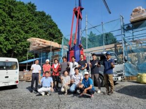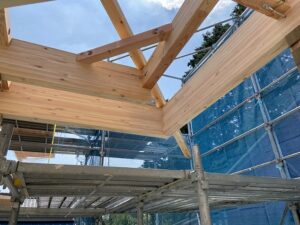 無事お昼には、棟があがりました(^^♪ 登り梁の意味は、後日説明いたします。