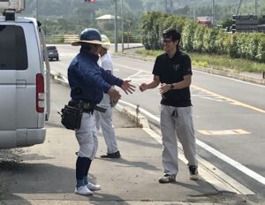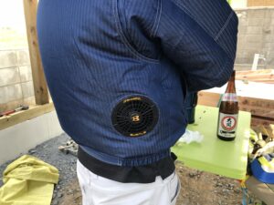 「さかな君」棟梁新兵器!ファンが2個所に付いていて、風を上着の中に入れ涼しくします。