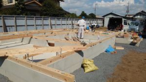 土台敷が終了しまして、今日足場を組みました。