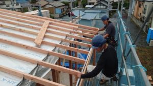 3次防水になる、タイベックシルバーを施工~タルキを打ち~鼻隠しを2人で打っています