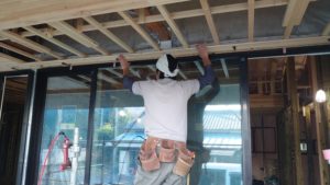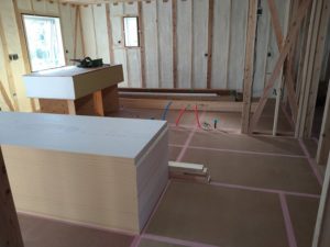 室内は、「かわまー棟梁」ボード搬入してこれからボード張りの段取りです。