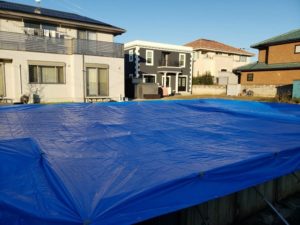 急激乾燥をしないようにシート養生をしています。いよいよ明日は、土台敷きになります。(^^♪