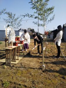 10時から地鎮祭がはじまり、四方払いをはじめたところの写真です。
