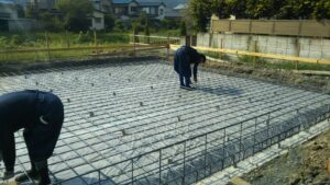 暑い中、鉄筋をひたすら組んでいます。綺麗にならんでいますね~
