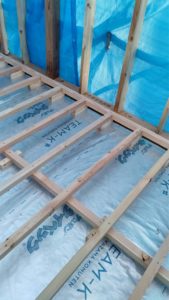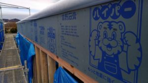 小屋梁から上の部分です。3次防水のタイベックシルバーを下の通気シートを