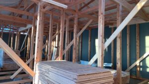 室内は、床の下地合板が積かさせてありこれから床下地も進めていきます。