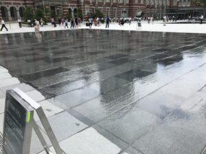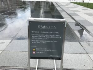 打ち水システムが駅の近くにあり、夏の涼しや景観も