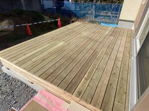デッキは、こんな感じです。ラグウッドと言いまして加圧注入で腐らない材木にしています。