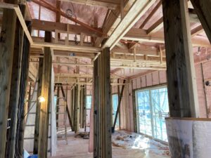 6本引き戸の鴨居を付けるのに3間飛ばしてあります梁に穴を開けなですむように金物を工夫しています。