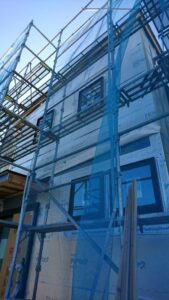 外部胴縁(外壁下地)が東面から始まりました。風の中ご苦労様ですm(__)m