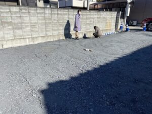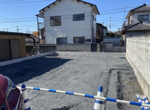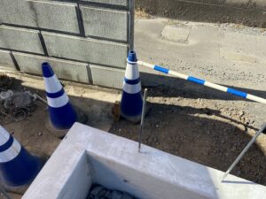 2項道路(4m未満の道)なので道路後退して土留めを作っています。