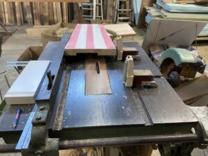 前面化粧の材料に溝をつけてからカットするという作業です。