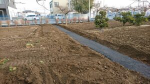 土地の東面は、コンクリートの土留めをします。段取りがはじまりました。