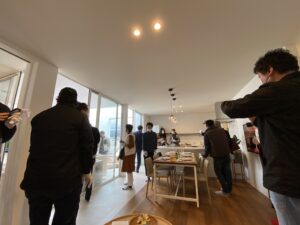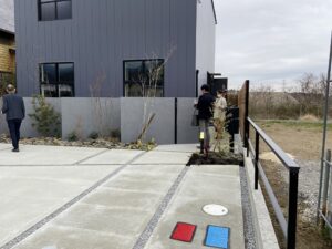 この白い外壁は、stoの塗りです。 グランピングの家での標準のモデルをはじめに見学しました。