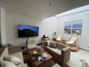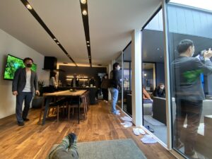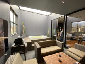 外にTVがあり、リビングには、小さい、壁掛けTVがあります。まずは、標準の建物1棟目で見学しました。