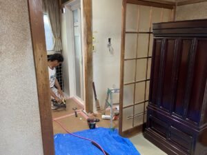 「タツミー」浴室入口の枠を付け~暑い中ご苦労様です。