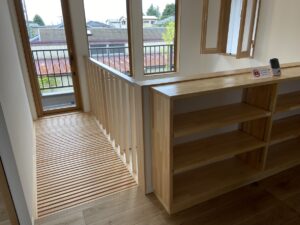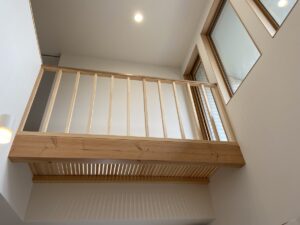 2階ホールからの写真です。 渡廊下の床は、桧材で格子床でつくりました。