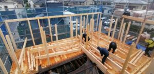 2階根太レス合板が設置でき~2階の柱が建てたとこです。