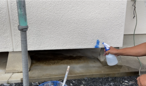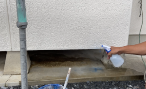 水に色を付けてス壁に付け~ 水を噴霧します。