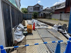 捨コンクリートを打ち、鉄筋材料が入り~外枠を組んでいくところです。