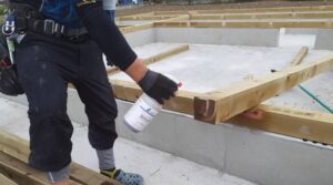 加圧注入している桧土台ですが、加工した穴部分にコシイの材料を噴霧しています。