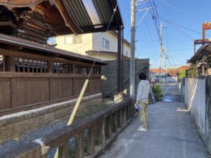 今日は、朝から神社の笠木の枠を外す工事で左官屋「ヨウイチー」がきました。